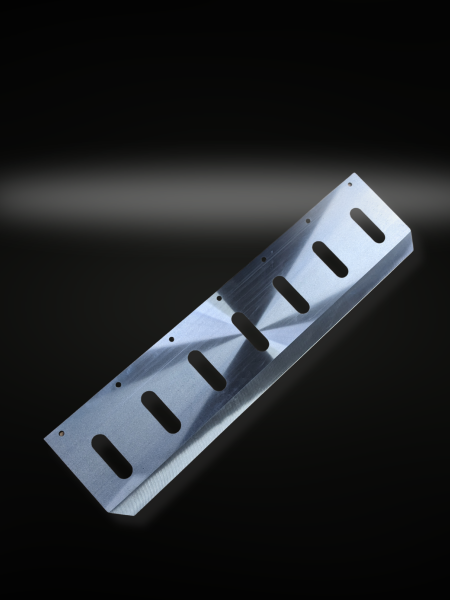Réalisée en INOX Z40C13 (1.4034), elle est donc adaptée aux normes alimentaires. Les dimensions sont 860x220x4. La lame dispose d'un double biseau à 6° et de 7 trous oblongs réalisés par un procédé de découpe laser.
